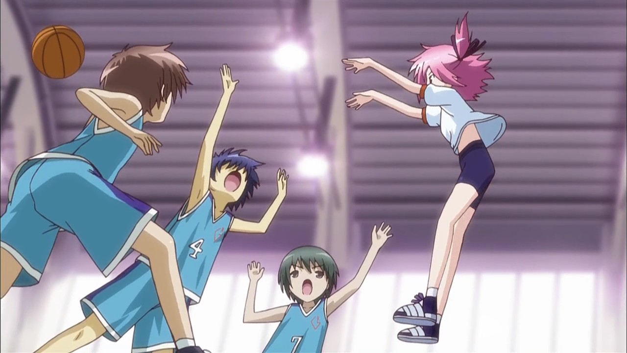 Маленький прокол: в этой сцене отлично видно, что Томока забрасывает из-за трёхочковой; тем не менее, за мяч она получает стандартные 2. Второй прокол будет тогда, когда после удара по руке Томока будет делать только 1 штрафной бросок (по правилам должна была бы делать два), так что в решающий момент команда лоли должна была бы не отствать на 1 очко, а, наоборот, вести +1 в счёте. Ну да ладно. |