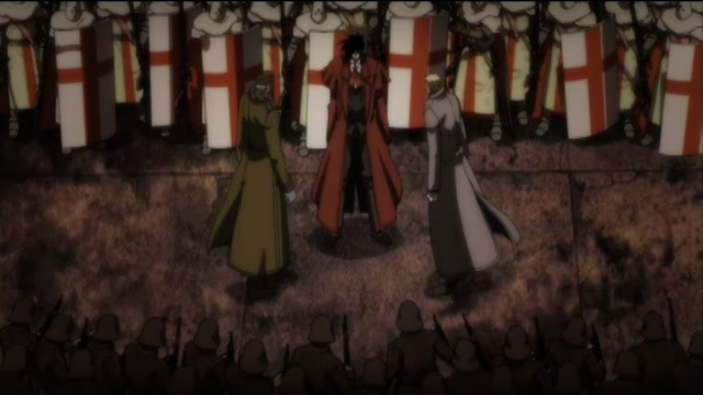 На второй план откатились не только Виктория и Интегра, но также и Монтана; даже ожидаемый (ну мангу-то все читали, верно?) переход Уолтера - и тот проскочил лишь вскользь. Главным получилось финальное противостояние "Хеллсинга" и "Искариотов", и даже лично - Алукарда и Андерсена.